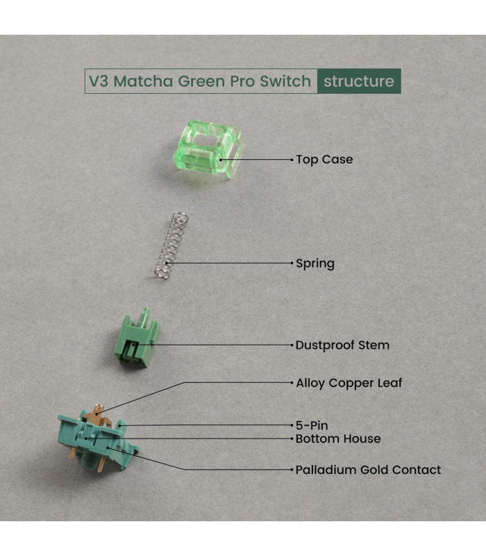 Die Pro-Version der Matcha Green-Schalter setzt neue Massstäbe in puncto Verarbeitung und Langlebigkeit. Verbesserte Fertigungstoleranzen und eine staubdichte Welle sorgen für kompromisslose Zuverlässigkeit, während die werksgeschmierte Führung für geschmeidige Bewegungen sorgt. Das optimierte Design gewährleistet zusätzliche Stabilität, und hochwertige Metalllegierungen der Kontakte garantieren eine verlängerte Lebensdauer.